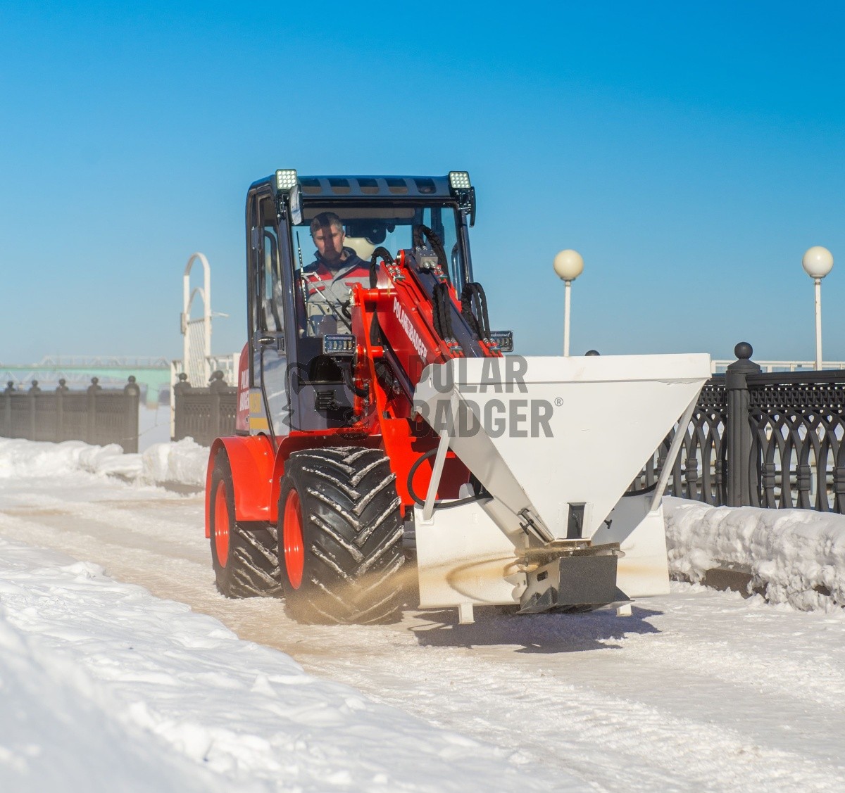 Пескоразбрасыватель мини-погрузчика — незаменимый помощник в коммунальном хозяйстве. Он равномерно распределяет ПГМ по обрабатываемой поверхности. Имеет шиберные заслонки, с помощью которых дозируются противогололедные материалы. Внутри бункера имеется система ворошения, которая улучшает распределение смеси.